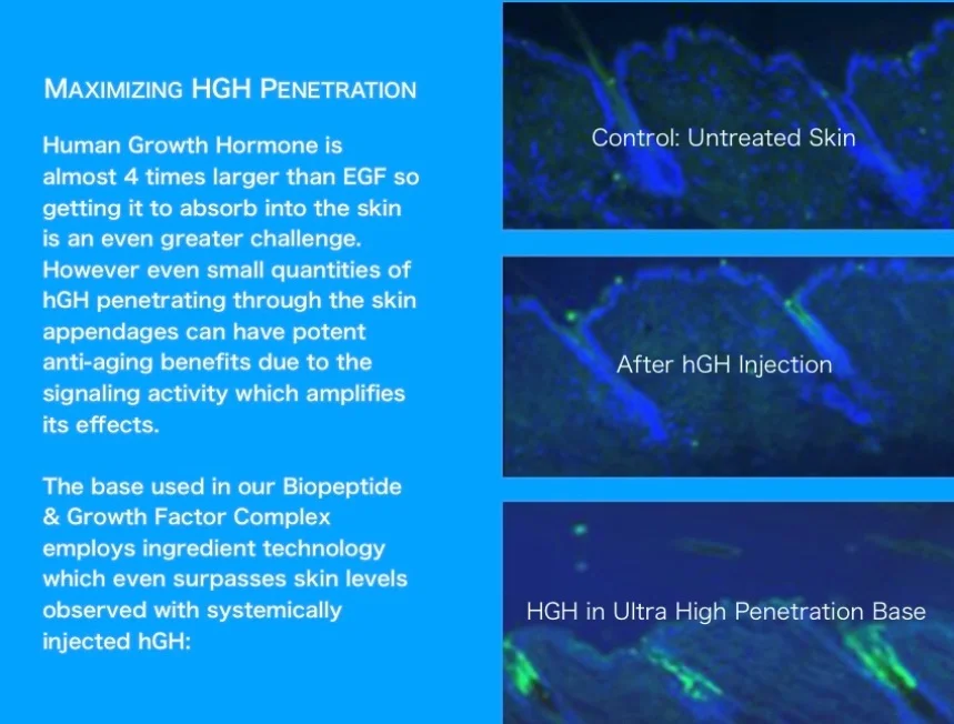 Like EGF, the levels drop with increasing age especially after age 30, so targeting aging skin changes with hGH is an effective strategy as long as sufficient levels can be achieved in the skin: