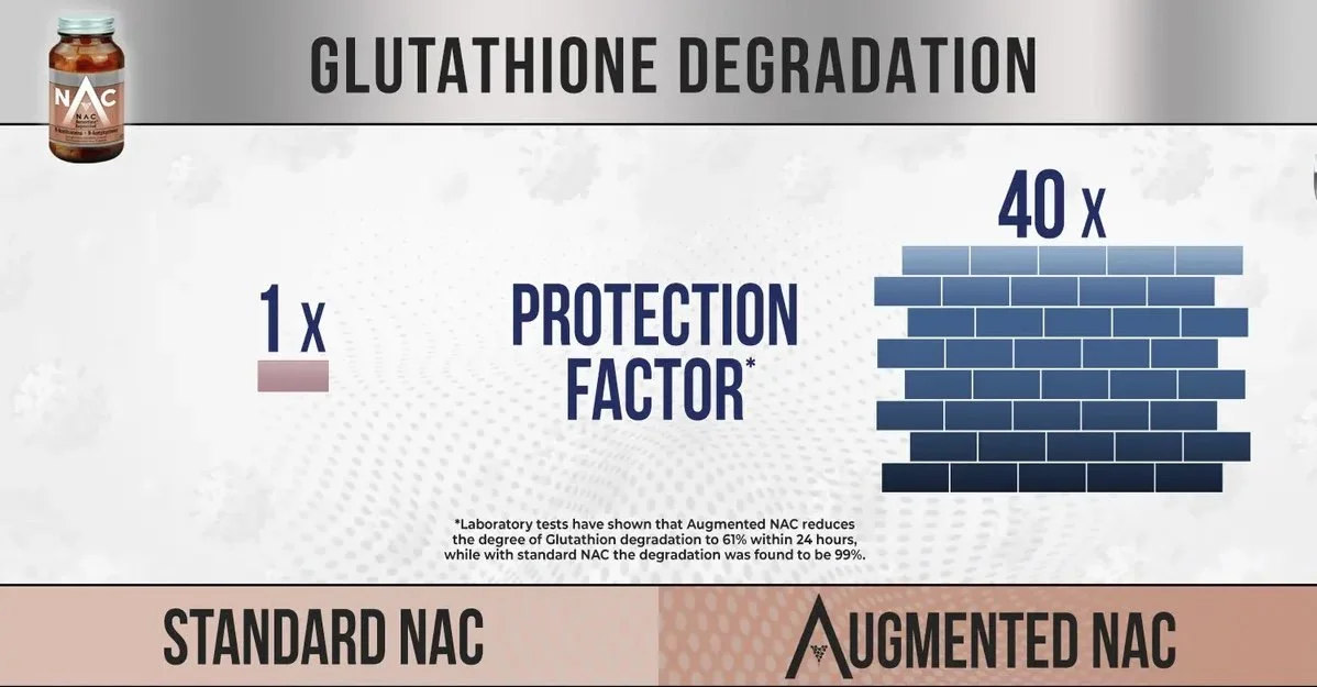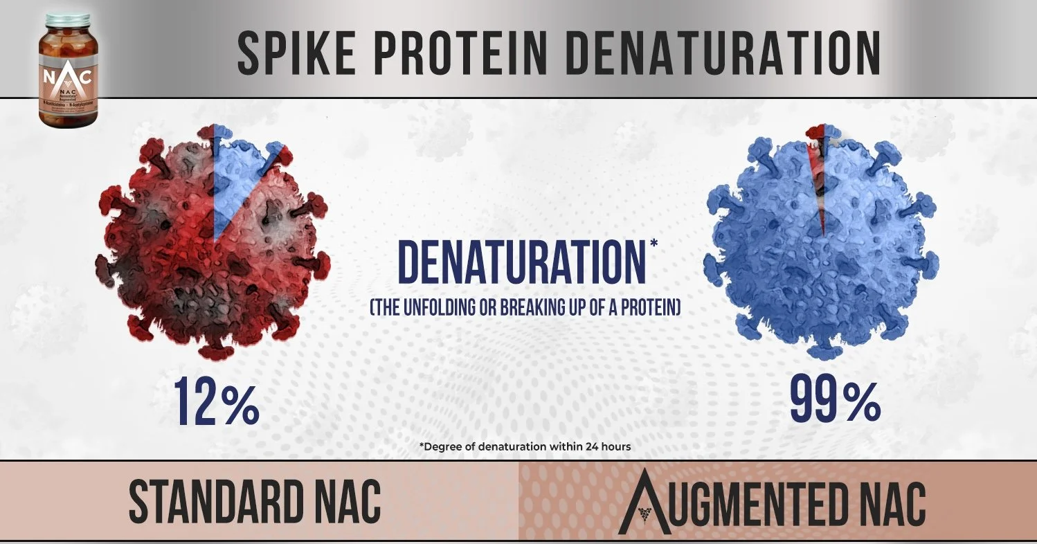 Several drugs and supplements have been recommended for their ability to block certain actions of the spike protein—a valuable strategy. However, the discovery that NAC can denature (i.e., destroy) the spike protein is particularly significant. The finding that standard NAC could denature 12 to 20% of spike proteins was an exciting discovery. However, Augmented NAC achieved a staggering 99.8% denaturation based on laboratory tests—a finding which offers enormous potential for those affected by spike-related conditions.